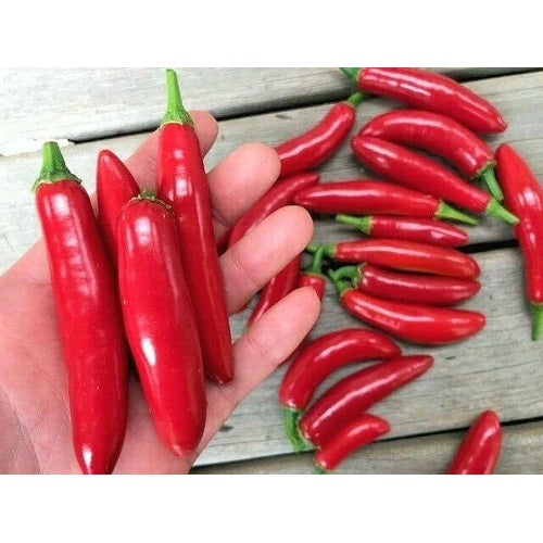 This is variety produces fruits that are 7-15cm, with smooth skin and a blunted end. Fruits turn from green to red. Plants have slightly hairy leaves and seem to withstand the cold better than most of the chillis we've grown. The plants are erect and branching, growing 60-70cm tall. This is a mild to hot variety with a heat level 8000-20,000 scoville units.
