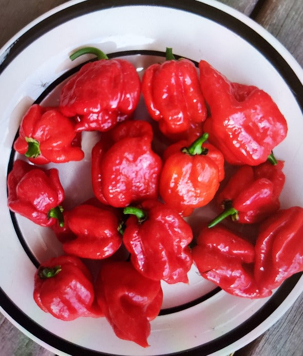 This chilli produces squat red fruit with EXTREME HEAT, handle with caution!