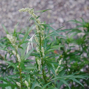 This is a hardy perennial herb similar to wormwood but with green foliage and grows to about 1-2m tall. The name derives from its original use which was to flavour drinks hence the word ‘mug’, other sources say it derives from the Norse word marsh. Mugwort has a variety of uses; it repels insects and has been traditionally used to regulate the menstrual cycle. It can also be used as a smoking herb. In the middle ages it was used to ward off evil spirits and protect from fatigue. In witchcraft it is said to induce lucid dreaming and astral travel when smoked. The small flowers are a butterfly and bee attractant or can be picked as a bittering agent in meat dishes. All round a very interesting herb!