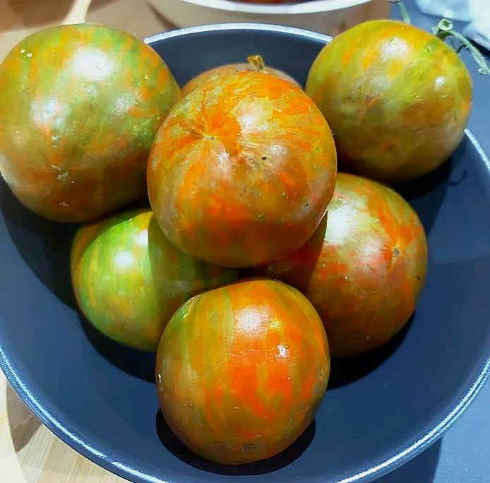 This is an old heirloom variety with gorgeous green fruits striped with orange. The fruits are large, meaty types with great flavour and very juicy. Excellent for sauces and eating fresh.